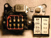Nach abnehmen des Deckels (Am oberen Rand leicht nach unten drücken und abheben) kommen die vier* Sicherungen zutage. Im Deckel sind liebevoll die einzelnen Stromkreise bezeichnet (Jaja die Japaner waren früher etwas verspielt). In den einzelnen Glasrörchen sind die "Sicherungsdrähte gut erkennbar. Bei Ersatz ist zu beachten, dass nur eine Sicherung der gleichen Stromstärke und Baugrösse einzusetzen ist. Die verwendeten Sicherungen haben die Masse 6 x 25 mm. Sie sind zu moderaten Preisen bei den den Grossen Drei ** zu bekommen. Rechts von den eingesetzten Sicherungen ist ein "Parkplatz" für eine Ersatzsicherung, wenn man es ein bischen quetscht, passen zwei übereinander, eine 10er und eine 20er. Brennt die ersetzte Sicherung sogleich wieder durch, muss man den Fehler im Kabelwurm suchen, keinesfalls die Sicherung mit Alupapier o.ä. flicken! Wenn so ein Kabelbaum (und dann meist das ganze Mopped) abbrennt, ist dies zwar für die Zuschauer interessant, aber für das Mopped selbst meist der Totalschaden.